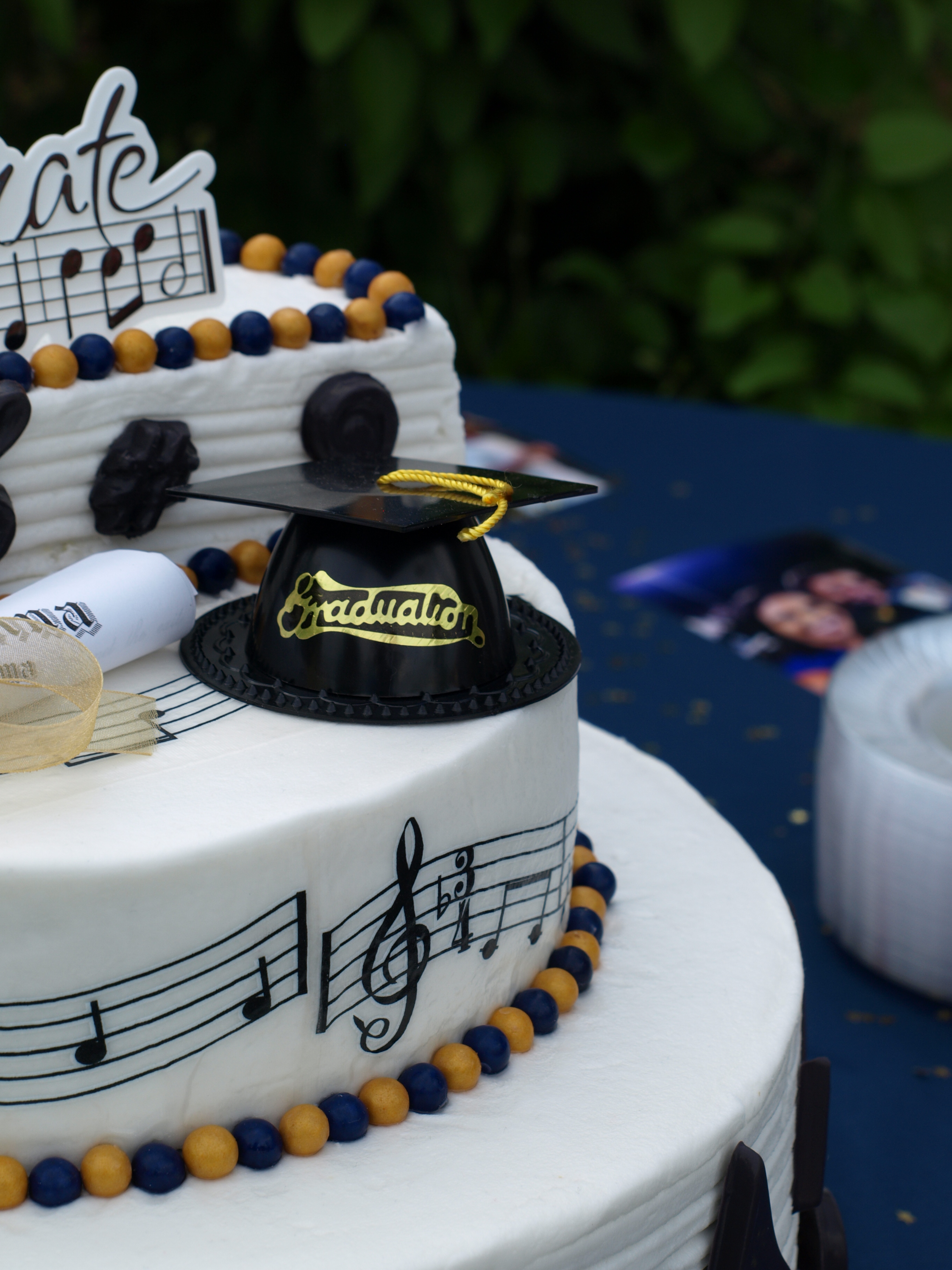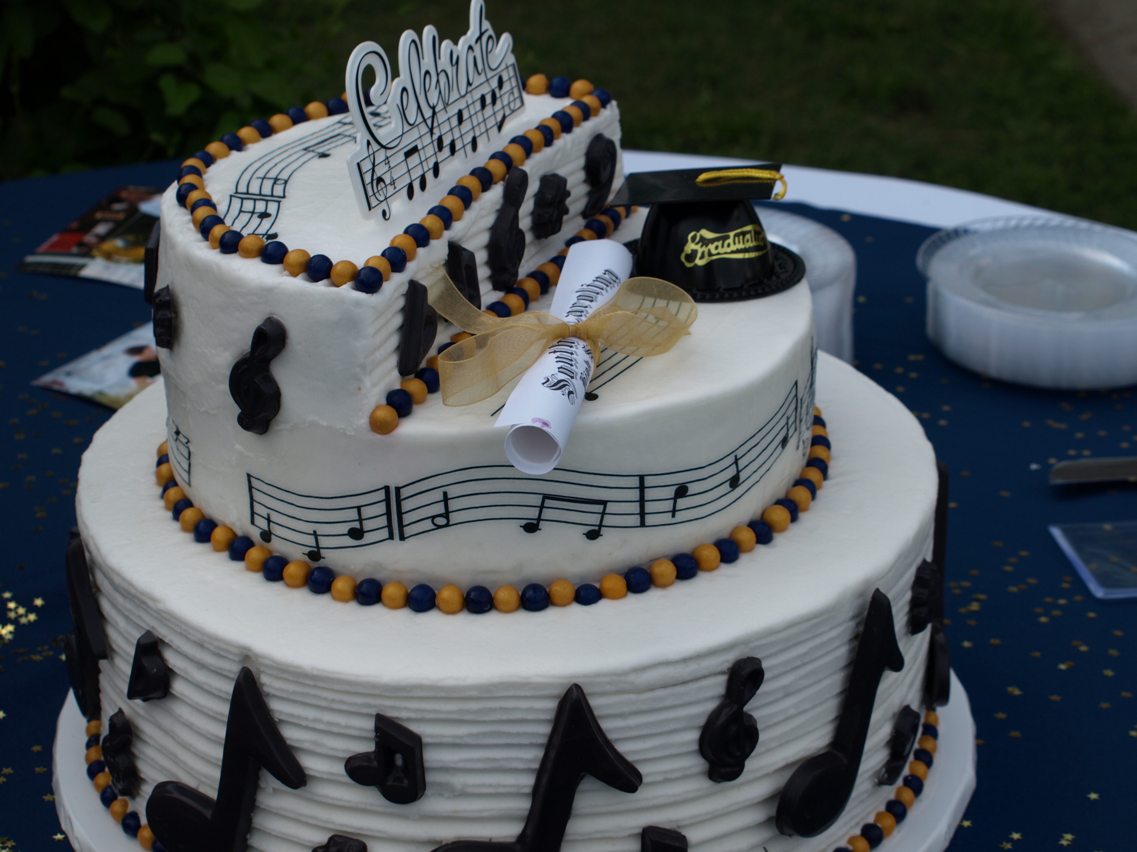 Thanks to the internet I was able to find the musical staff with notes sugar transfer sheets as well as the plastic “celebrate” easel for the top of the cake and the plastic “graduate” cap.
